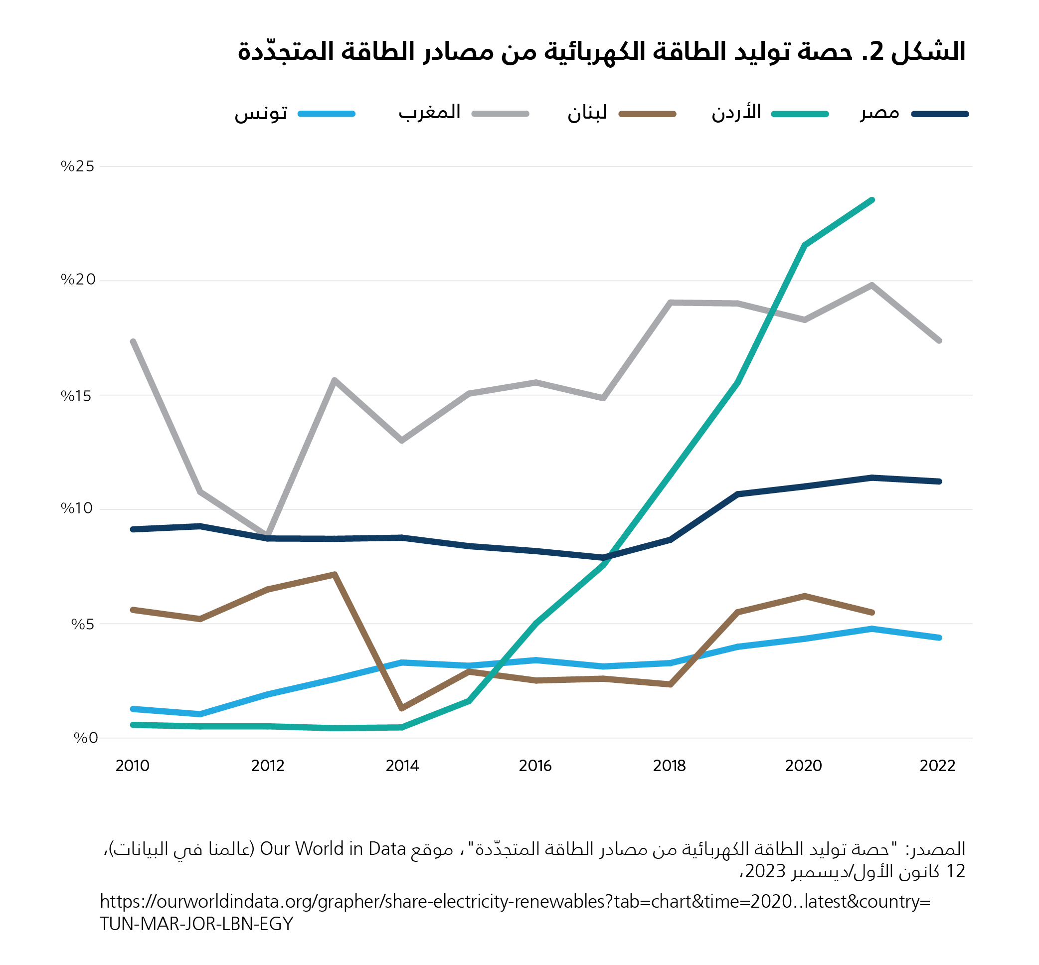 أما الضعف الهيكلي الثاني الذي أبرزته الصدمة في قطاع الطاقة، فيتمثّل في النجاح المحدود الذي حقّقته البلدان منخفضة ومتوسّطة الدخل في تنويع مصادر الطاقة لديها إلى حدٍّ كبير. ومن بين هذه البلدان في منطقة الشرق الأوسط وشمال أفريقيا، وحدهما الأردن والمغرب أحرزا تقدّمًا ملموسًا في هذا المجال، وتخطَّيا مصر وتونس ولبنان (انظر الشكل 2). ففي الأردن، حدّد قانون الطاقة المتجدّدة للعام 2012 هدفًا يتمثّل في تأمين 10 في المئة من مزيج الطاقة في البلاد من مصادر الطاقة المتجدّدة بحلول العام 2020، خصوصًا طاقة الرياح والطاقة الشمسية.123 واللافت أن هذا الهدف جرى تحقيقه وتجاوزه، إذ شكّلت الطاقة الشمسية وطاقة الرياح 20 في المئة من مزيج الطاقة في الأردن. هذا الأمر عزّز قدرة البلاد على الصمود أمام التحديات التي عصفت بقطاع الطاقة. ويسعى الأردن إلى زيادة حصّة مصادر الطاقة المتجدّدة بنسبة 30 في المئة بحلول العام 2030، مُبديًا التزامه بتطوير الطاقة المتجدّدة. وعلى النحو نفسه، قطع المغرب أشواطًا كبيرة نحو تنويع إنتاجه من الطاقة، إذ ارتفعت حصّة مصادره المتجدّدة في توليد الطاقة من 10 في المئة في العام 2012، إلى حوالى 20 في المئة في العام 2021، قبل اندلاع الحرب في أوكرانيا.124